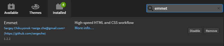 Plugin Brackets Selanjutnya ketik Emmet pada search box kemudian install. Oh iya, komputermu harus online dengan internet jika ingin menginstall plugin ini.