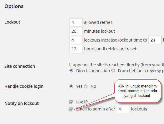 2. Masuk ke Setting > Limit Login Attempts untuk melakukan setting. Menurut saya, setting standar sepertinya cukup memadai. Mungkin kamu cuma perlu  menambah “Notify on lockout : Email to Admin …”