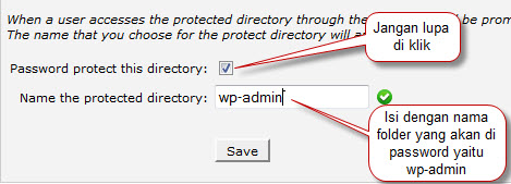 Jangan sampai lupa di klik “Password protect this directory”. Jika sudah diisi seperti gambar di atas, maka klik save. Password dan username sebaiknya berbeda dengan paassword saat login ke blog wordpress.