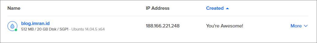 Kamu telah berhasil membuat droplet server untuk blog milikmu. Kita akan lanjutkan dengan Cara melakukan koneksi ke server dengan SSH dan Cara mengamankan login ke VPS .