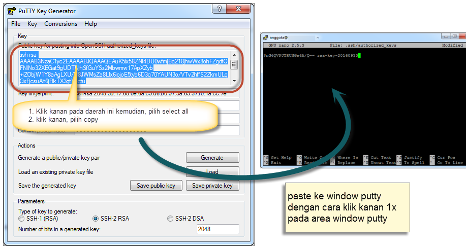 - Setelah di load, copy public key dan paste ke dalam area window nano pada langkah 11.