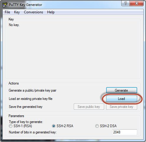 - Jalankan PuTTYgen, kemudian load kembali private key yang telah di buat sebelumnya. Cara membuat private key bisa di baca di sini. Load kembali dengan meng-klik tombol Load seperti gambar di bawah