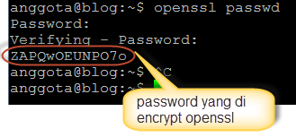 - Buatlah password yang terenkripsi dengan tools openssl.